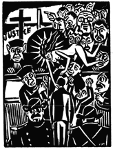 Masereel’s work in the “woodcut novel” genre contains his greatest achievement, Mon Livre d’Heures (kept in print by City Lights books under the title Passionate Journey). Mon Livre d’Heures is a small masterpiece, a kind of autobiography of the spirit. The story is characterized by a love of human labor, a sacramental devotion to the everyday, and a view of human identity as a complex interpenetration of circumstances, both personal and historical. It ends with a bold intrusion of metaphysics, as unexpected as it is profoundly affecting.The two Masereel books that have been returned to print are also woodcut novels, Story Without Words and The Idea, published together in one volume by Shambhala Press. Neither are up to the standard of Mon Livre d’Heures, but both are very enjoyable. As Thomas Mann wrote of Masereel’s lesser works: “They are all so strangely compelling, so deeply felt, so rich in ideas that one never tires of looking at them.”